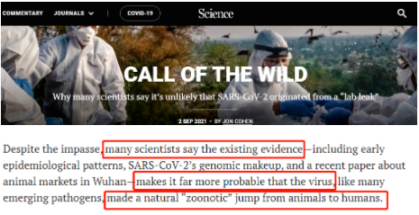 △希尔齐克在文章中开门见山地指出,在这场疫情中,伪科学几乎总能在真科学面前占上风,最典型的例子之一就是不少人相信新冠病毒源于实验室。尽管越来越多的证据表明病毒是通过自然途径传播给人类的,但CNN、调查性新闻网站“拦截”和《大西洋月刊》等媒体的报道又让“实验室泄漏论”甚嚣尘上。