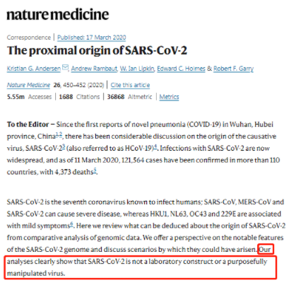 至于两人提到的另外三篇所谓支持“实验室泄漏论”的论文更是离谱。尤其是第三篇2020年3月发表在《自然》杂志上的论文,作者在文中甚至直接明确表示“我们不相信任何类型的基于实验室起源的假设是合理的”。