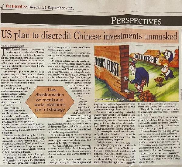 津巴布韦《先驱报》9月21日刊登的稿件《美国抹黑中国投资的计划曝光》。新华社记者 张玉亮 摄