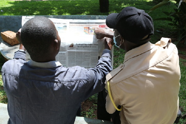 10月14日,在津巴布韦首都哈拉雷,当地读者阅读《先驱报》。新华社记者 张玉亮 摄