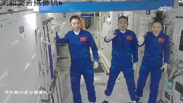△10月16日,在神舟十三号载人飞船与空间站组合体成功实现自主快速交会对接并按程序完成各项工作后,航天员翟志刚、王亚平、叶光富进入天和核心舱。(图自视觉中国)