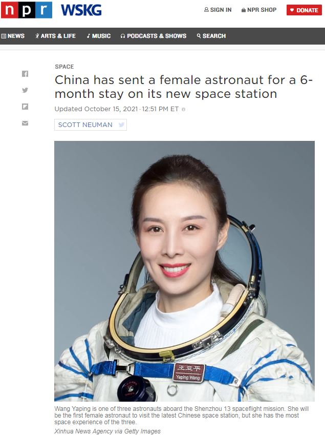 美国全国公共广播电台的报道聚焦在女航天员王亚平的身上。报道称,中国空间站将迎来首位女航天员,她也将成为中国第一位女性太空行走者,将进行多次舱外活动。