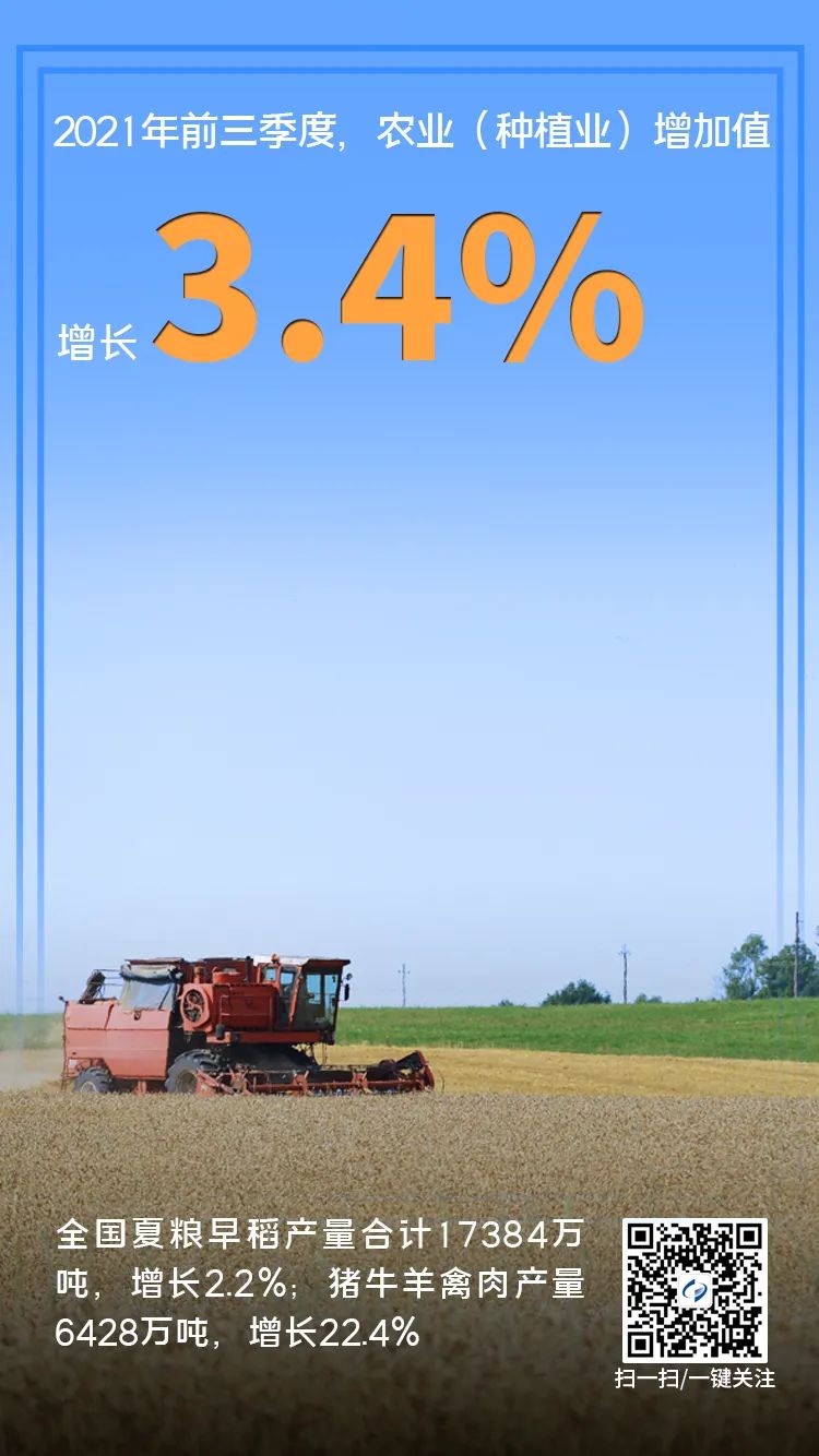 前三季度,农业(种植业)增加值同比增长3.4%,两年平均增长3.6%。全国夏粮早稻产量合计17384万吨(3477亿斤),比上年增加369万吨(74亿斤),增长2.2%。秋粮播种面积稳中有增,其中,玉米播种面积增加较多;主要秋粮作物总体长势较好,全年粮食生产有望再获丰收。前三季度,猪牛羊禽肉产量6428万吨,同比增长22.4%,其中猪肉、羊肉、牛肉、禽肉产量同比分别增长38.0%、5.3%、3.9%、3.8%;牛奶产量同比增长8.0%,禽蛋产量下降2.4%。三季度末,生猪存栏43764万头,同比增长18.2%;其中,能繁殖母猪存栏4459万头,增长16.7%。