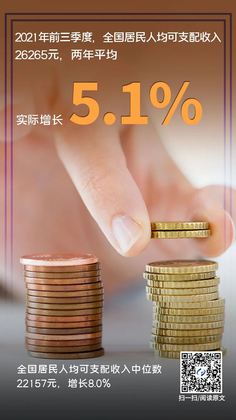 前三季度,全国居民人均可支配收入26265元,同比名义增长10.4%,两年平均增长7.1%;扣除价格因素同比实际增长9.7%,两年平均增长5.1%,与经济增长基本同步。按常住地分,城镇居民人均可支配收入35946元,同比名义增长9.5%,实际增长8.7%;农村居民人均可支配收入13726元,同比名义增长11.6%,实际增长11.2%。从收入来源看,全国居民人均工资性收入、经营净收入、财产净收入、转移净收入同比分别名义增长10.6%、12.4%、11.4%、7.9%。城乡居民人均收入比值2.62,比上年同期缩小0.05。全国居民人均可支配收入中位数22157元,同比名义增长8.0%。