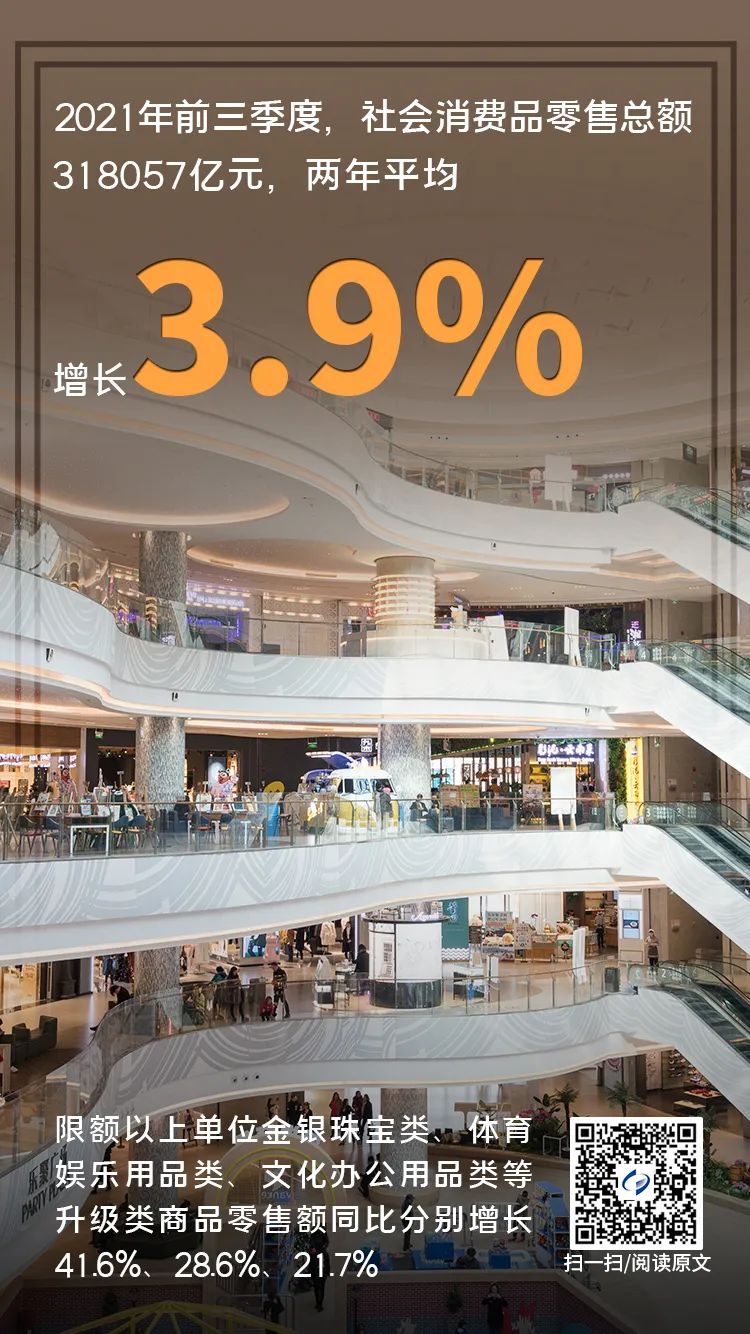 前三季度,社会消费品零售总额318057亿元,同比增长16.4%,两年平均增长3.9%。9月份,社会消费品零售总额36833亿元,同比增长4.4%,比上月加快1.9个百分点;两年平均增长3.8%,加快2.3个百分点;环比增长0.30%。
