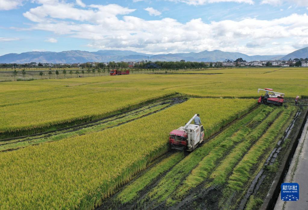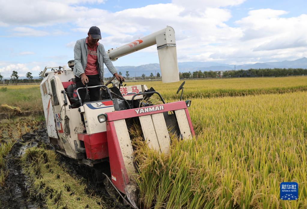 当日,云南省大理市“洱海留香”绿色水稻种植基地开镰。近年来,云南农垦集团在大理市环洱海流域开展规模化绿色有机优质水稻种植,打造出特色大米“云粮·洱海留香”。