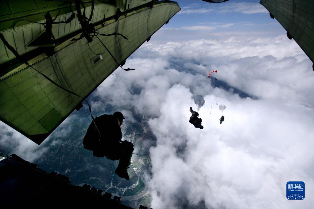 15名空降兵从地震灾区四川茂县上空4999米的高空奋不顾身跳下,进入道路阻断的灾区参加救援(2008年5月14日摄)。新华社发(刘应华 摄)