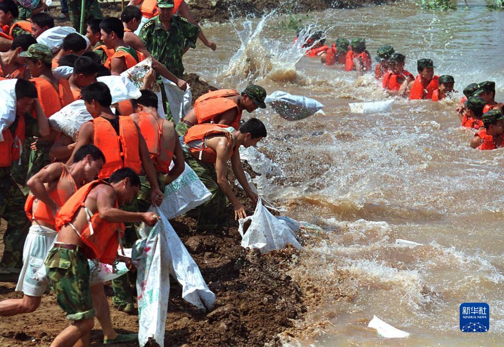 解放军官兵在湖北石首久合垸乡团山河支堤“管涌”险情处抗洪抢险(1998年8月11日摄)。新华社记者 李刚 摄