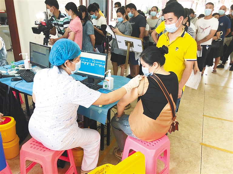 海南日报记者在现场看到,在村委会办公楼大院,分别设置了接种新冠疫苗等候区、咨询区、登记区、注射区和留观区5个区域。村民戴着口罩依次排队测量体温、填写健康情况、登记信息、接种疫苗、进行留观,现场秩序井然。