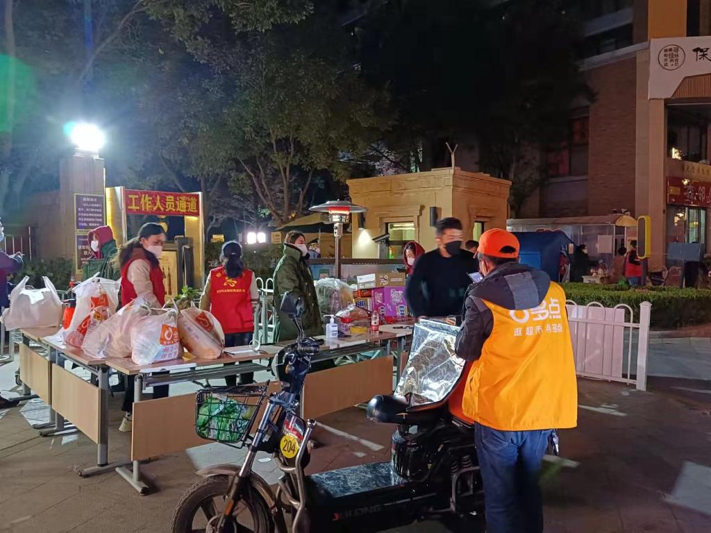 封闭管理之下,居民生活如何保障?记者在小区入口处看到,一辆辆写有楼号的手推车整齐排列,居民网上下单、电话订购或亲朋送来的必备生活物资堆放在集中地点,由志愿者和工作人员按备注信息装进相应楼号的手推车,进行分发配送。