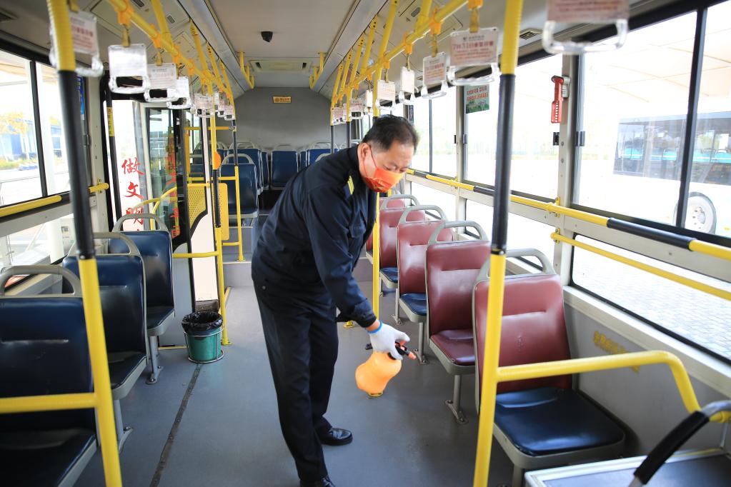 吴忠市公交司机正在对车辆进行日常消杀(吴忠市委宣传部供图)