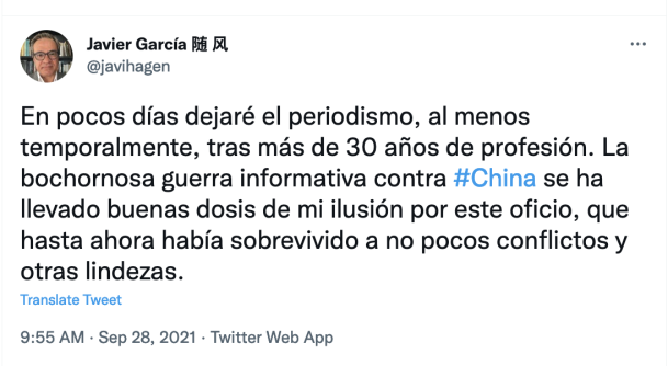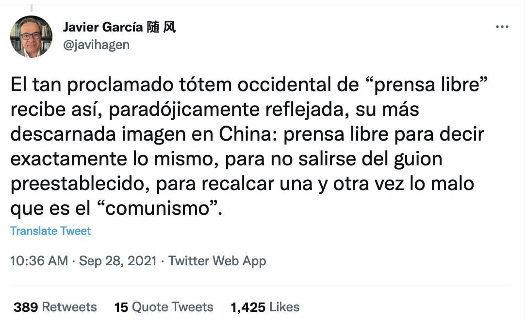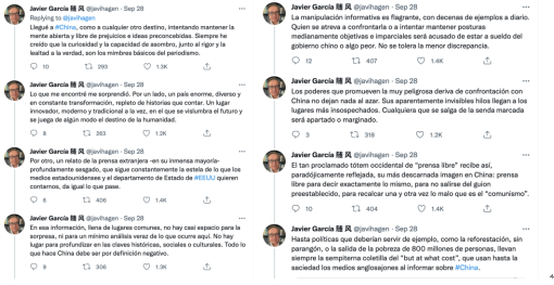 而对于西方国家的无端指责,9月28日,世界最大的西班牙语通讯社埃菲社驻华记者站负责人加西亚在推特上连发14条推文,表示厌倦了西方某些媒体长期抹黑中国的行径,决心来个“断舍离”。