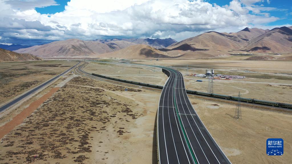 在京藏高速那曲至羊八井段,火车经过跨青藏铁路特大桥(5月30日摄,无人机照片)。新华社发(胡雪峰 摄)