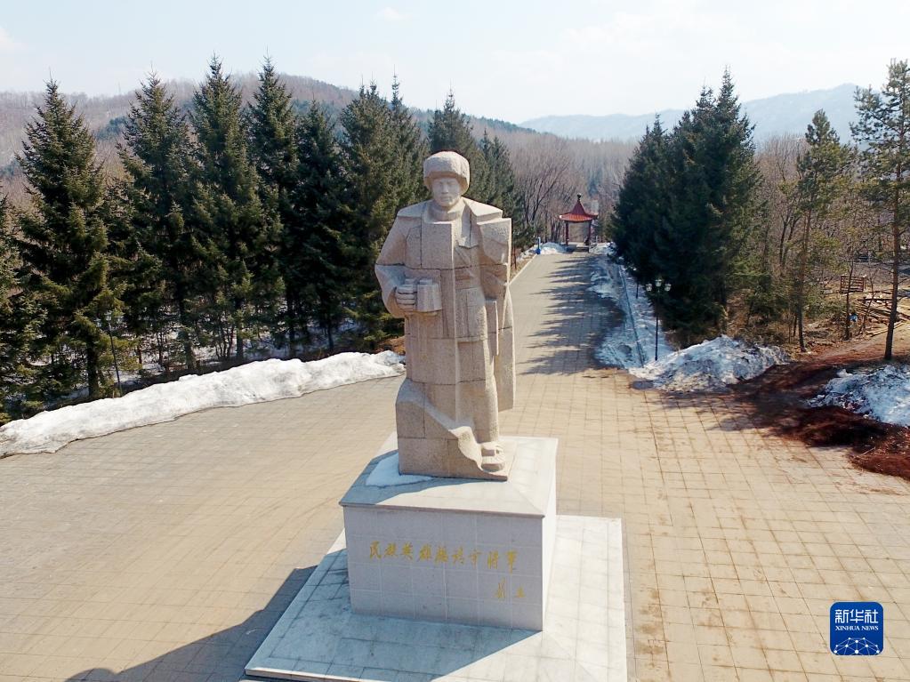 矗立在吉林省靖宇县杨靖宇将军殉国地的杨靖宇雕像(2017年3月22日摄)。新华社记者 曾涛 摄