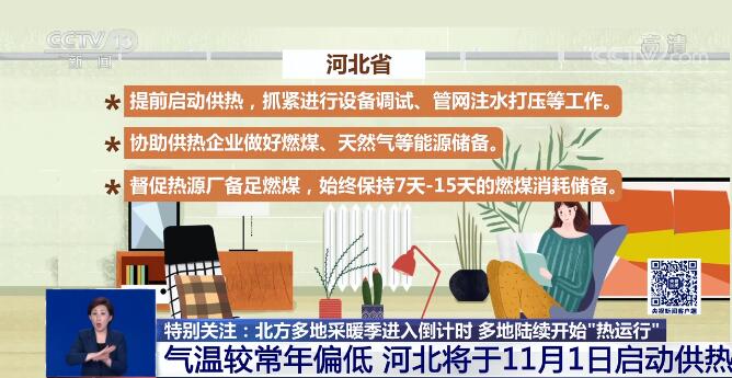 记者从河北省政府了解到,河北省将于11月1日启动供热。根据河北省气象局天气预测分析,2021—2022年度采暖季法定供热日之前,10月下旬至11月上旬,河北省有3次不同程度的冷空气活动,气温较常年同期偏低,河北省决定提前启动供热,将抓紧进行设备调试、管网注水打压等工作。同时,协助供热企业做好燃煤、天然气等能源储备。督促热源厂备足燃煤,并根据煤炭消耗、运输条件和天气变化情况持续补进,始终保持7天—15天的燃煤消耗储备。