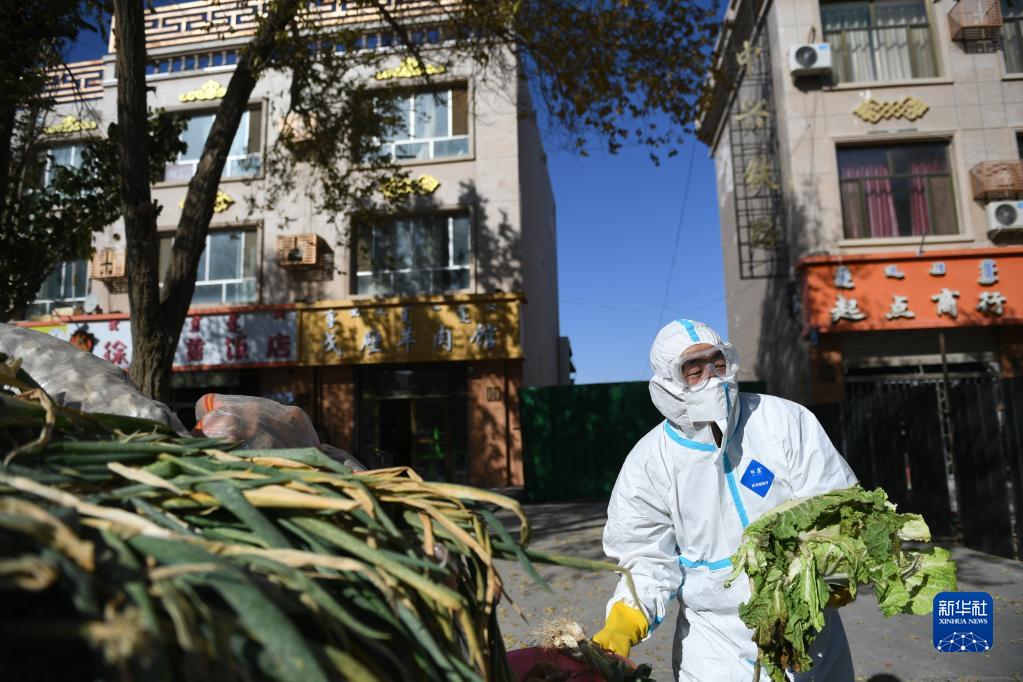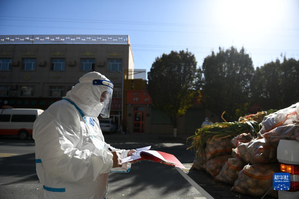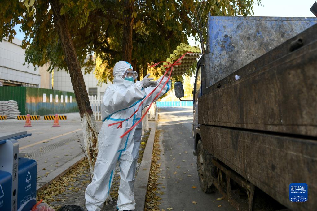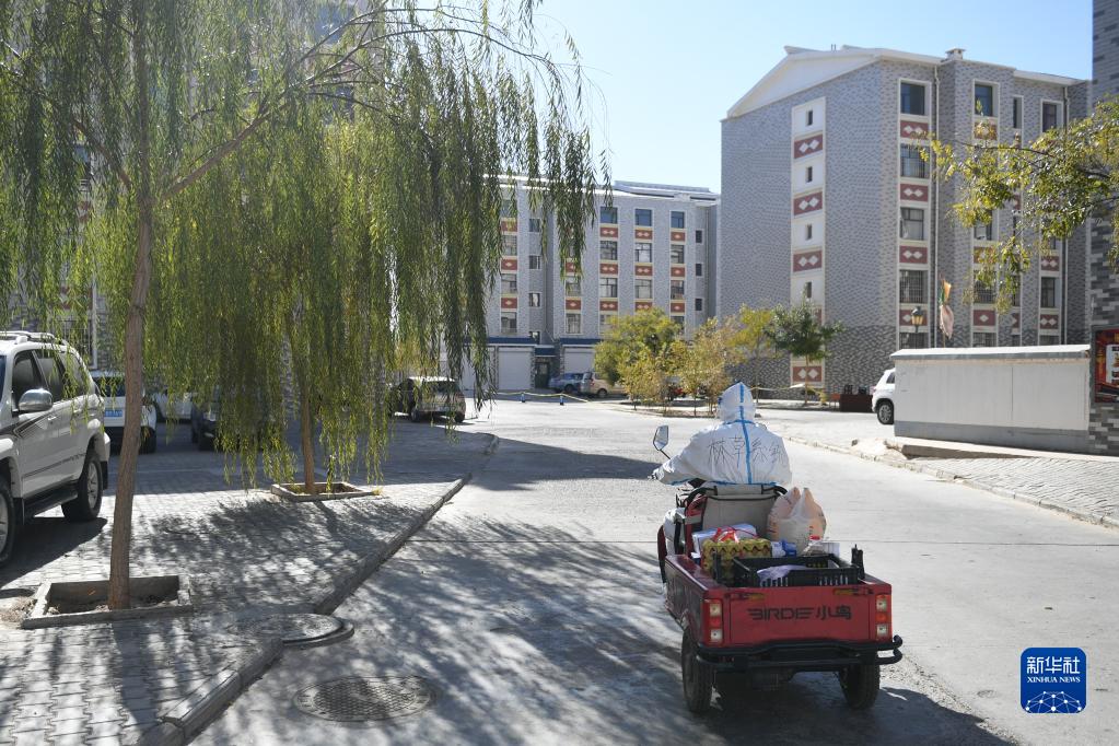 10月27日,包联干部石多仁驾驶电动三轮车在达来呼布镇居延名郡小区运送生活物资。新华社记者 贝赫 摄