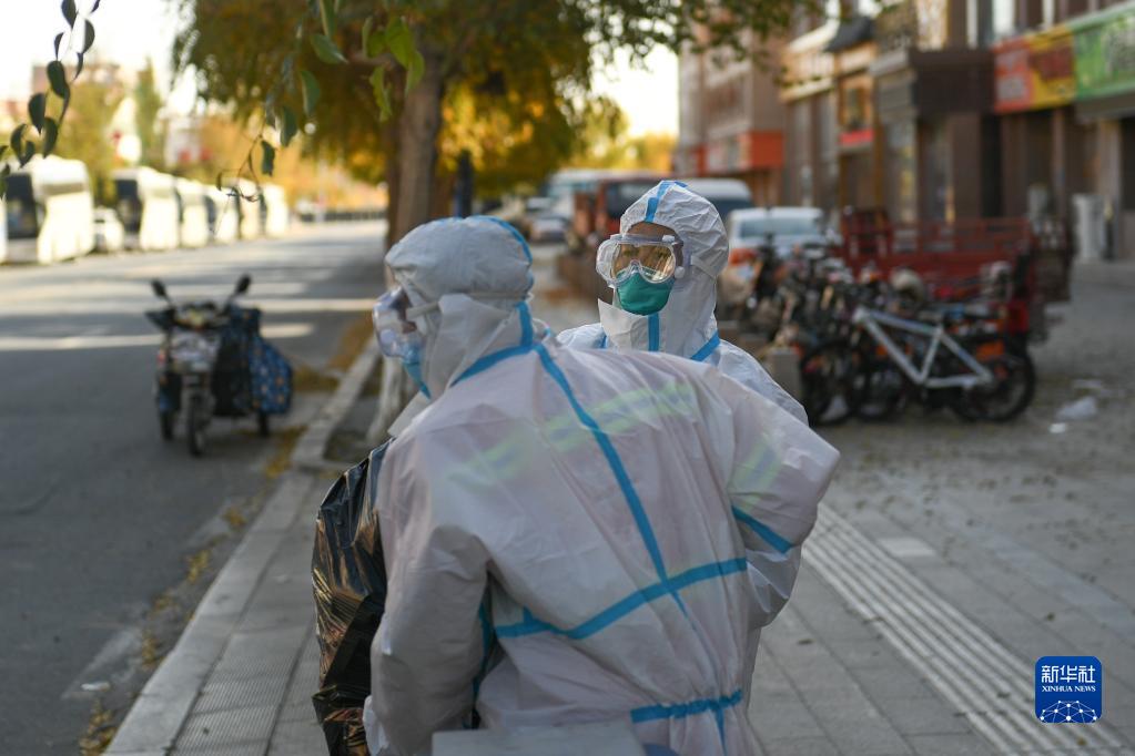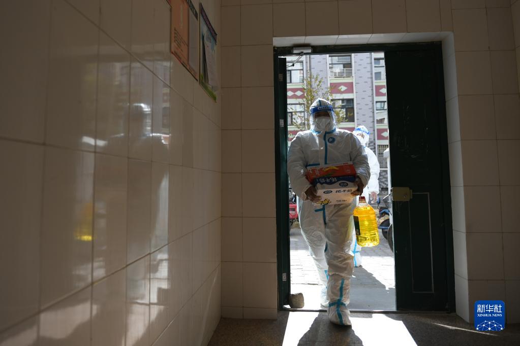 10月27日,包联干部早青(前)与石多仁在达来呼布镇居延名郡小区入户送生活物资。新华社记者 贝赫 摄