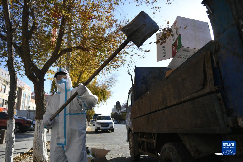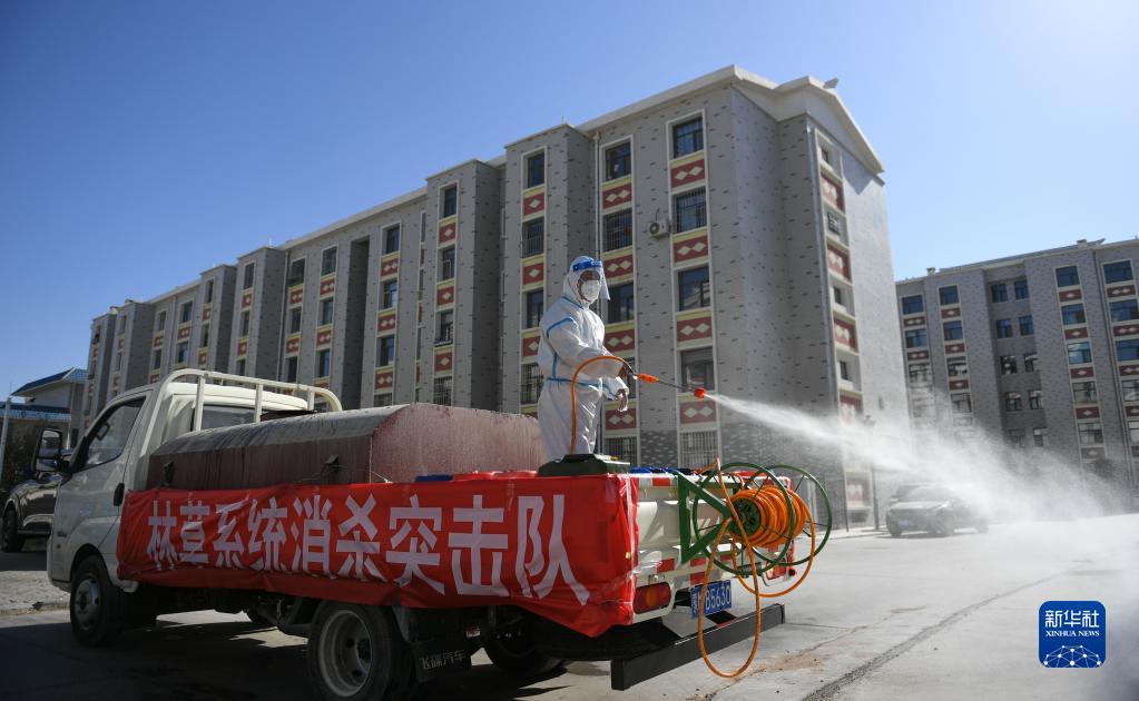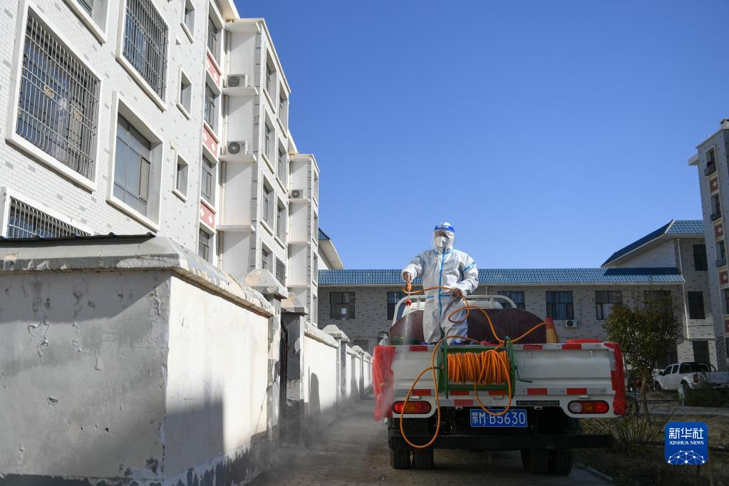 10月27日,包联干部章保成在达来呼布镇居延名郡小区进行消杀。新华社记者 贝赫 摄