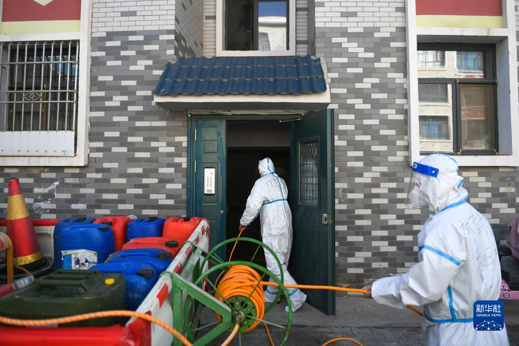 10月27日,包联干部在达来呼布镇居延名郡小区入单元楼进行消杀。新华社记者 贝赫 摄