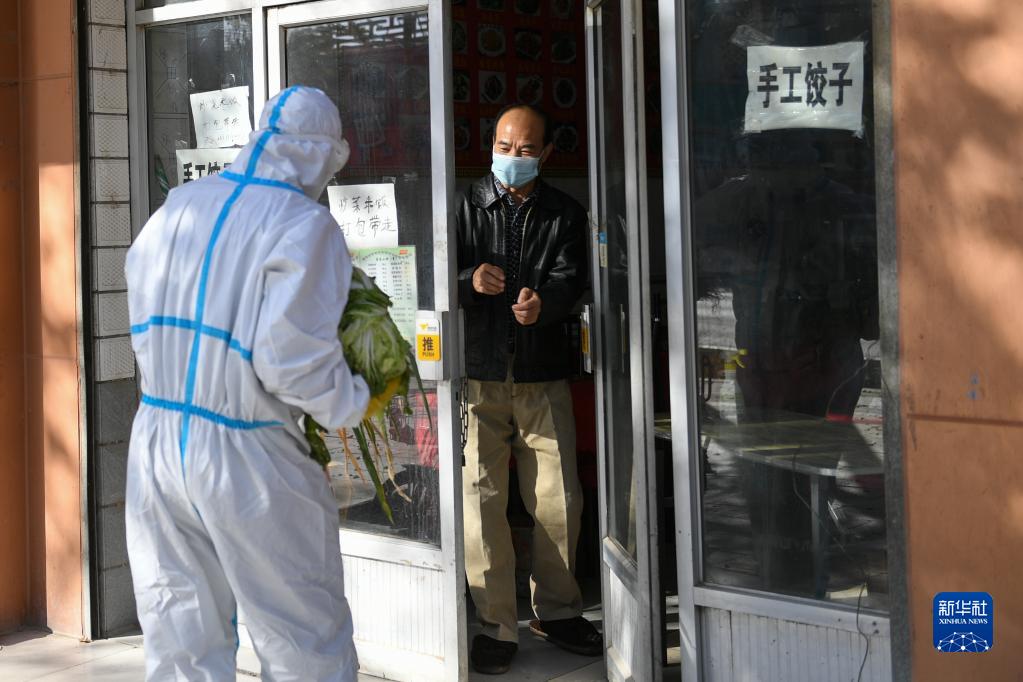 10月27日,包联干部(左)将蔬菜交给达来呼布镇街边商户。新华社记者 贝赫 摄