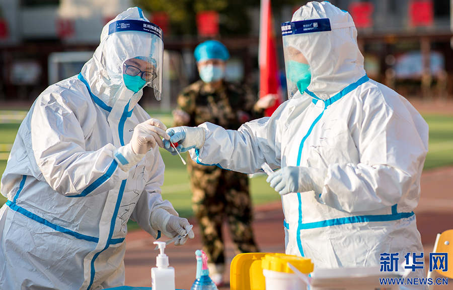 29日,呼和浩特市玉泉区长和廊街道大召广场核酸采样点,医务人员为居民进行核酸检测取样。新华网发(丁根厚 摄)