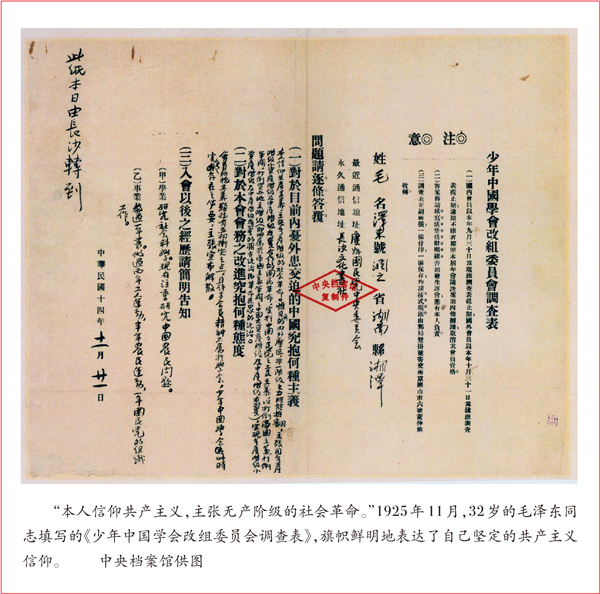 ——“毛泽东同志在青年时期就立下拯救民族于危难的远大志向……十月革命一声炮响,给中国送来了马克思列宁主义。从纷然杂陈的各种观点和路径中,经过反复比较和鉴别,毛泽东同志毅然选择了马克思列宁主义,选择了为实现共产主义而奋斗的崇高理想。在此后的革命生涯中,不管是‘倒海翻江卷巨澜’,还是‘雄关漫道真如铁’,毛泽东同志始终都矢志不移、执着追求。”