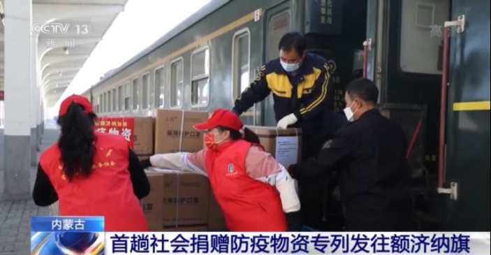 11月1日,首趟装运着社会爱心人士捐赠物资的专列从内蒙古巴彦淖尔市临河站开往额济纳,支援当地抗疫工作。这些防疫物资包括6万多个口罩、420瓶消毒液、200套防护服等。