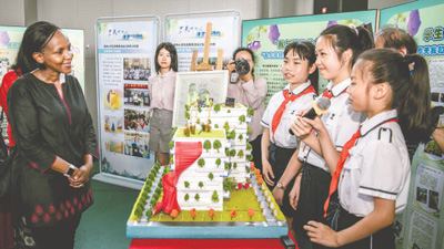 2019年6月5日,世界环境日全球主场活动在浙江杭州举行。活动期间,环境署副执行主任乔伊斯·姆苏亚(左一)在杭州一所国家级绿色学校考察。联合国环境规划署供图