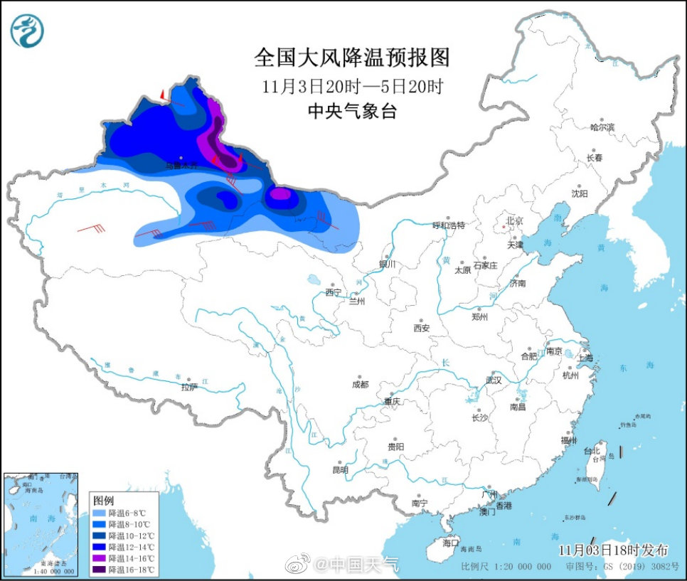 预计3日20时至5日20时,新疆北部和东部、内蒙古西部、甘肃西部气温将下降8~10℃,其中新疆东北部和内蒙古西部部分地区降幅可达12~14℃,局地16℃以上;并伴有4~6级偏北风,阵风7~8级,山口地区风力可达9~10级。