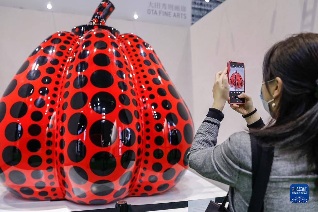 11月5日,观众在展馆内拍摄日本艺术家草间弥生的作品《南瓜》。