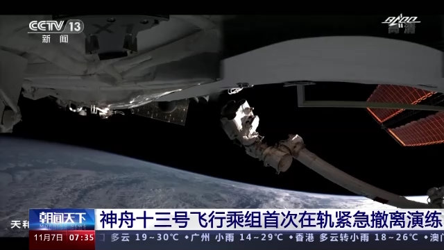 总台央视记者 刘冠青:这里是航天员中心的航天员支持中心的监控大厅,在我身后的大屏幕上大家可以看到的是天和核心舱,这个是天和气闸舱的定向摄像机。现在神舟十三号航天员乘组正在进行他们在轨工作的第一次紧急撤离演练,这一次的演练主要是模拟核心舱遭遇撞击,内部产生了失压的情况,三名航天员要紧急撤离到神舟十三号的返回舱当中。
