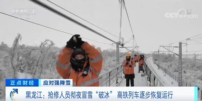 央视网消息:经铁路抢修人员彻夜清冰,黑龙江受暴雪冰冻天气影响的高铁线路运输秩序逐步恢复,目前京哈高铁、哈佳铁路已正常运行。