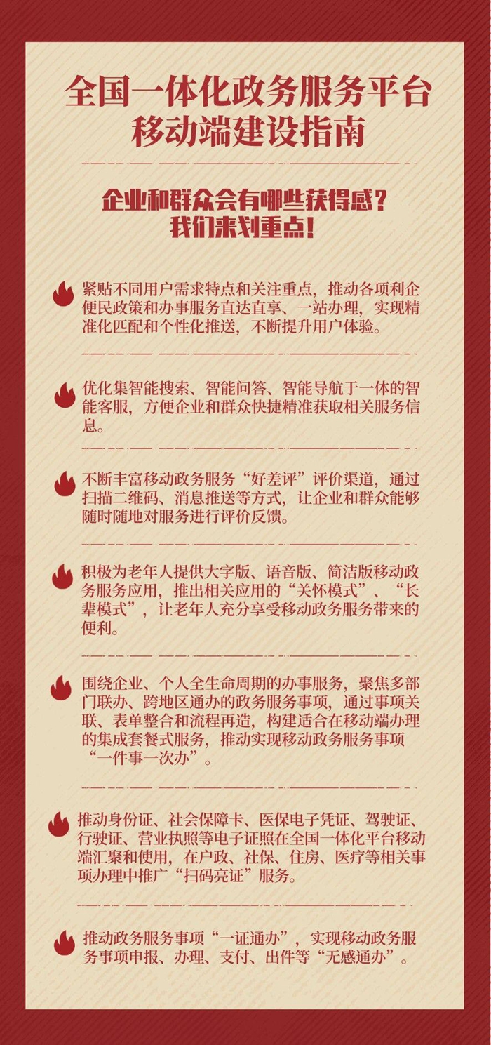 《建设指南》提出,各地区和国务院有关部门要围绕企业和群众办事需求,进一步优化政务服务平台移动端功能,不断丰富集成套餐式服务和“扫码亮证”、“一证通办”、“无感通办”等应用场景,充分利用移动互联网新技术,持续提升移动政务服务便利化水平。