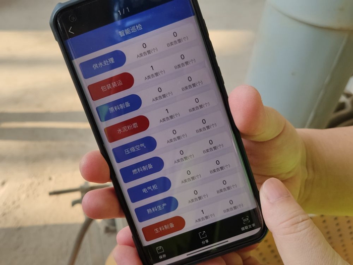 在华新水泥(黄石)有限公司生料车间,现场工作人员正在用手机查看智能巡检App。 新华社记者 万芃琦 摄