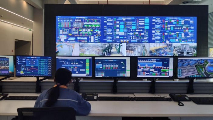 就在距生料车间不远处的办公楼内,中控室的大屏幕上,显示着整个工厂的实时生产画面。工作人员只用在数字系统上操作,对应的实体生产环节便会按照指令运行。
