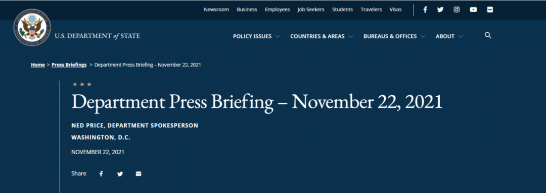 在当地时间22日举行的美国国务院记者会上,发言人普莱斯被问及中方因立陶宛允许台当局设立所谓“驻立陶宛台湾代表处”,决定将中立两国外交关系降为代办级,美方是否可能给予立陶宛支持?普莱斯声称“支持”。