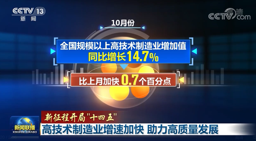 10月份,全国规模以上高技术制造业增加值同比增长14.7%,比上月加快0.7个百分点。