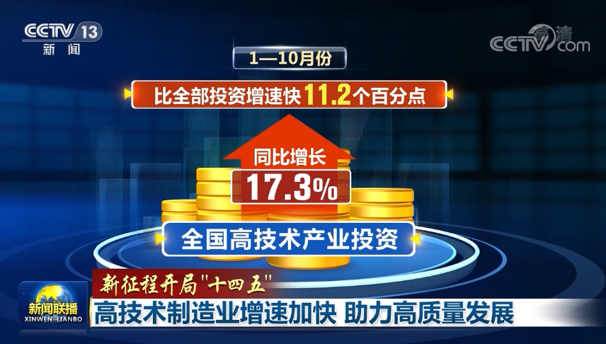 在高技术制造业带动作用持续增强的同时,更多新投资也在不断涌入。1—10月份,全国高技术产业投资同比增长17.3%,比全部投资增速快11.2个百分点。