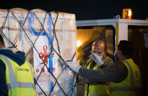 中国援助埃及的首批新冠疫苗2月23日凌晨运抵开罗,援助阿盟秘书处的新冠疫苗也同机抵达。新华社记者 邬惠我 摄