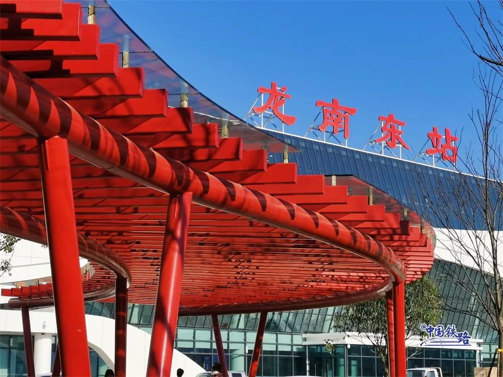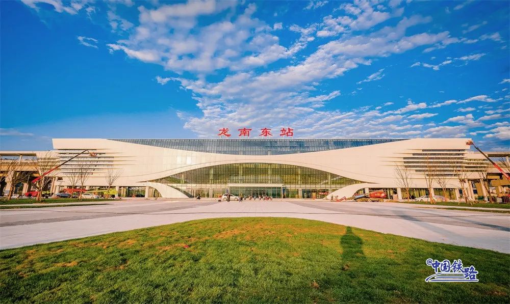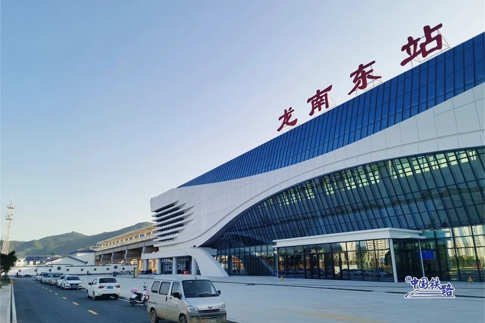 赣深高铁龙南东站为小型客运专线铁路站房,建筑面积9999平方米,车站规模2台4线,最高可容纳800人。最有特色的一点是,该站站台飞架于桥梁之上,站房则建于线路正下方。
