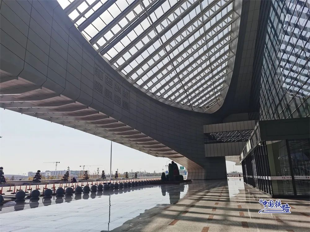 站房两侧的玻璃幕墙以顺畅的流线型分隔向中部收拢,犹如两条游龙聚首,形成恢弘大气的整体格局。
