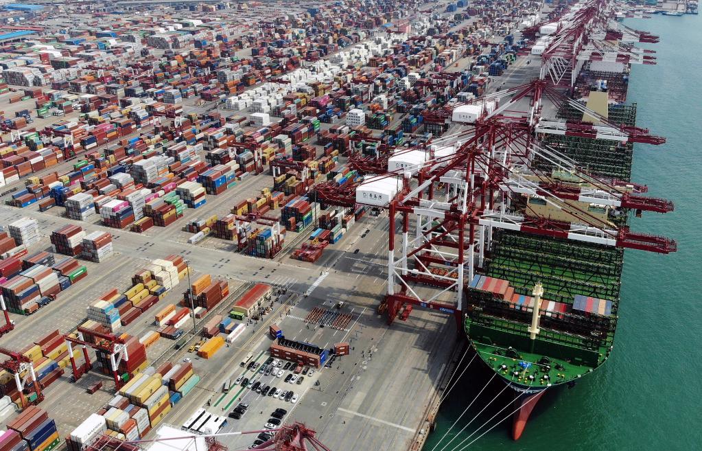 载箱量可达2.4万标准箱的“现代商船阿尔赫西拉斯”轮靠泊在青岛港前湾码头(2020年4月26日摄,无人机照片)。(新华社记者李紫恒摄)