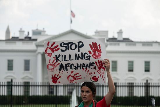 8月28日,美国华盛顿特区,抗议者在白宫前举行示威,质疑美军在喀布尔机场的撤离程序和美国对阿富汗的承诺。 视觉中国供图