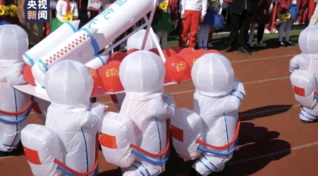 一年级小学生穿“航天服”走方阵,终于圆了“航天梦”,头盔也挡不住他们满满的自豪感。