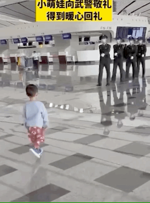看到执勤的武警战士,小男孩马上立正敬礼。