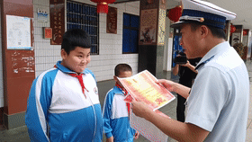 一名小学生和同伴协力“抢修”路边漏水的消防栓,当消防人员为他颁奖,他假装严肃却忍不住开心地偷笑。