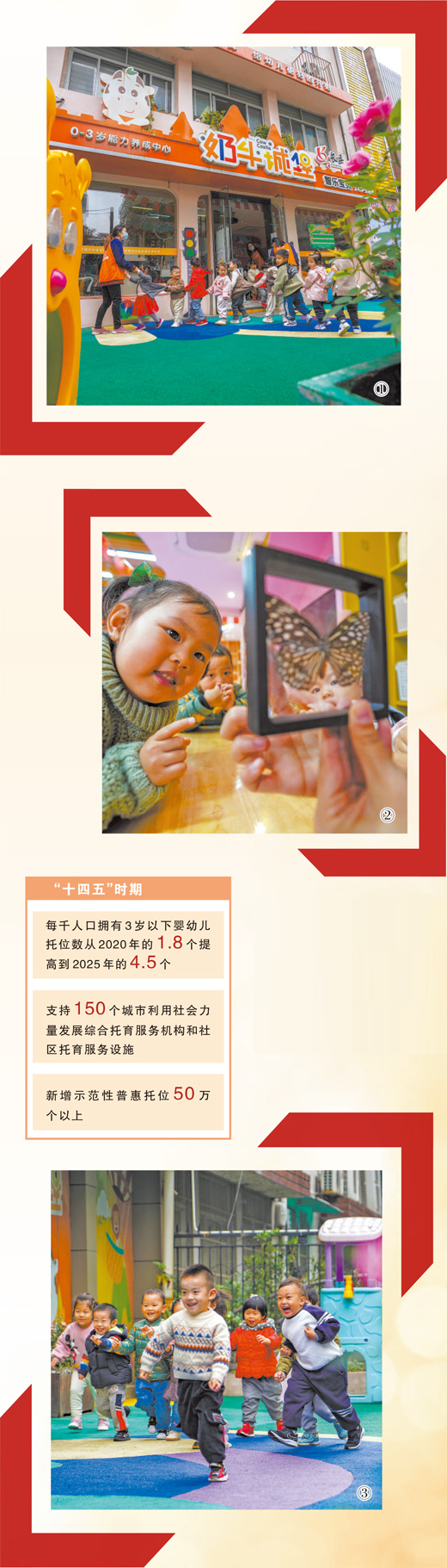 图①:浙江省杭州市拱墅区长庆街道奶牛城堡托育园的孩子们与老师在课间互动。