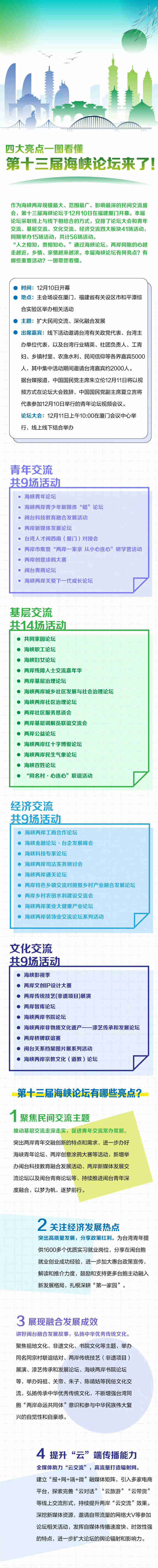 作为海峡两岸规模最大、范围最广、影响最深的民间交流盛会,第十三届海峡论坛于今日(12月10日)在福建厦门开幕。本届海峡论坛采取线上与线下相结合的方式,安排了论坛大会和青年交流、基层交流、文化交流、经济交流四大板块41场活动。本届海峡论坛有何亮点?有哪些重要活动?一图带您看懂。