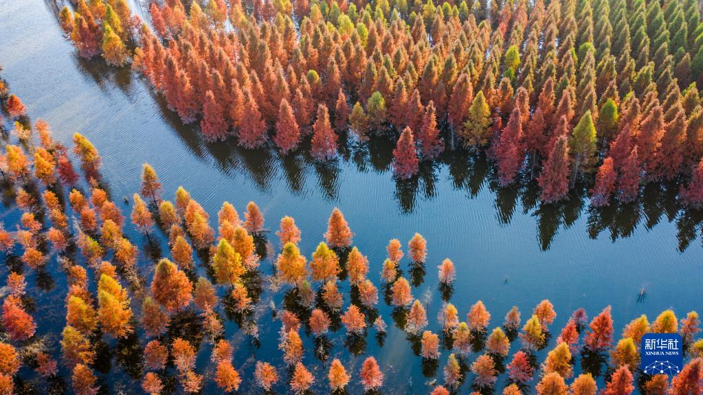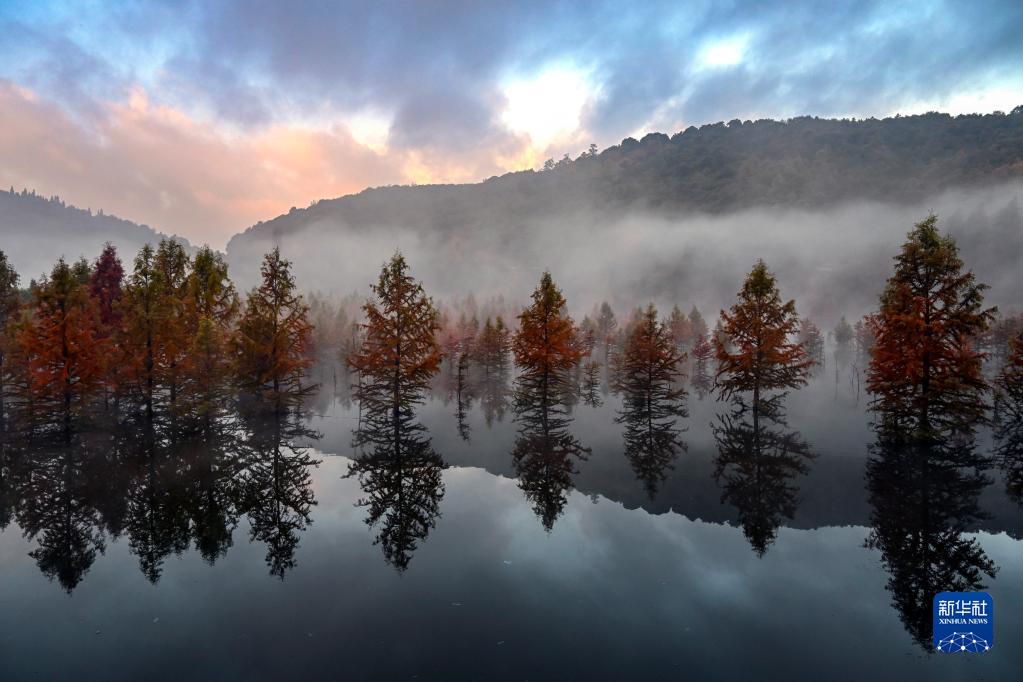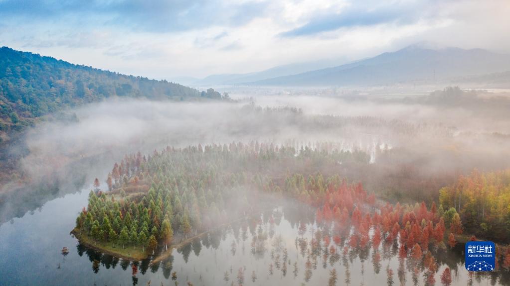 冬日,云南省昆明市盘龙区滇源街道甸尾村水杉湿地的水杉林色彩艳丽,景色如画。这片水杉湿地位于滇池上游、昆明松华坝水源保护区内。
