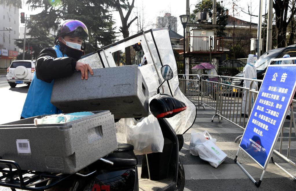 12月17日,外卖小哥在西安市兴善寺东街管控区外等待取货。新华社记者 刘潇 摄